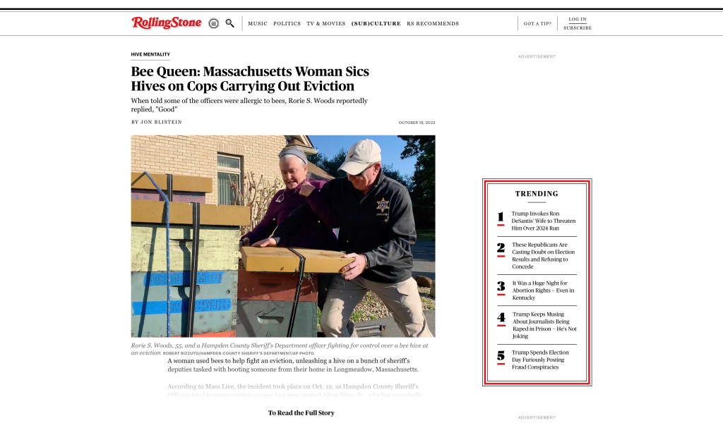 Mockup Project for “Bee Queen: Massachusetts Woman Sics Hives on Cops Carrying Out Eviction” from Rolling Stone