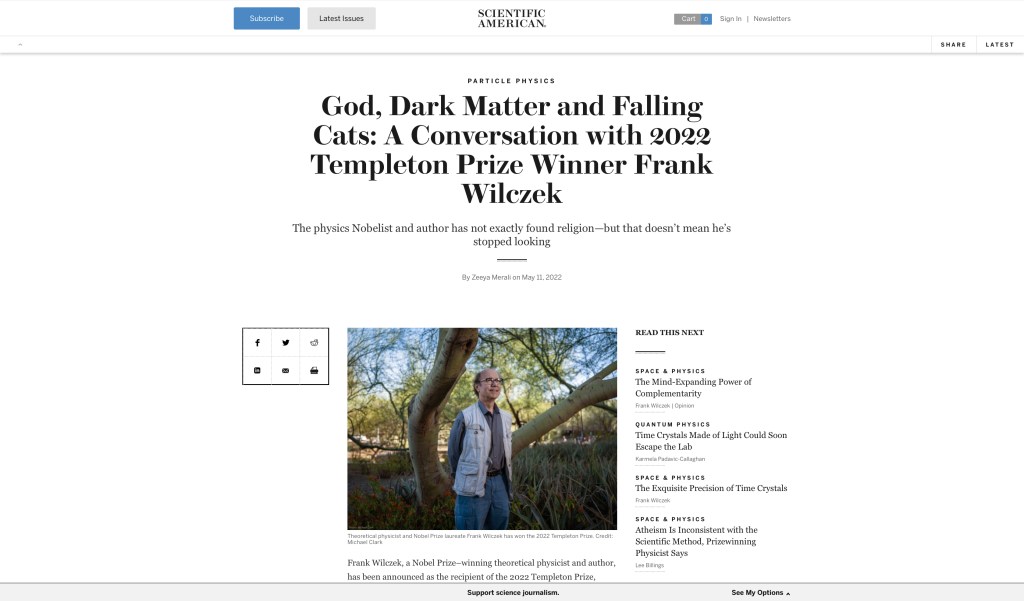 Mock Project for “God, Dark Matter and Falling Cats: A Conversation with 2022 Templeton Prize Winner Frank Wilczek” from the Scientific American